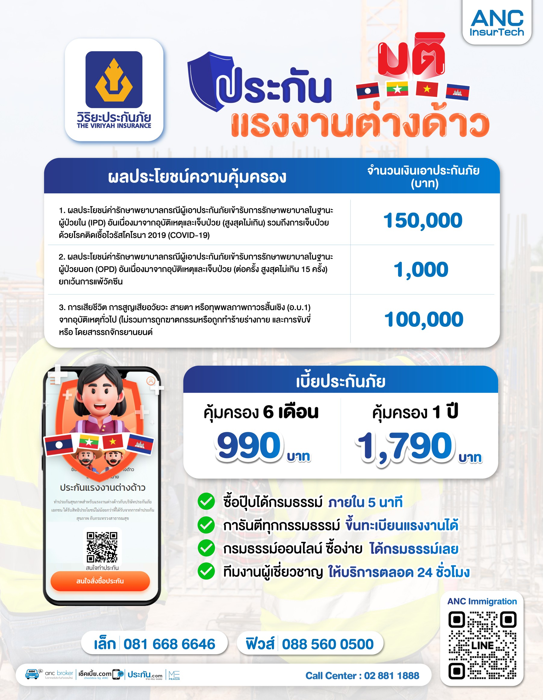 บริษัท เอ เอ็น ซี โบรกเกอร์เรจ จํากัด จึงมีความตั้งใจที่จะนำเสนอแผนประกันแรงงานต่างด้าวที่สามารถดูแลค่ารักษาพยาบาลได้อย่างครอบคลุม เพื่อให้ผู้เอาประกันภัยได้ประโยชน์สูงสุดในการทำประกันภัย บริษัทฯ จึงพร้อมมอบความคุ้มครองที่ครบถ้วน เบี้ยประกันราคาเดียวเพียง 990 บาท คุ้มครองนาน 6 เดือน โดยไม่ต้องตอบคำถามสุขภาพและตรวจสุขภาพเพิ่มเติม สามารถสมัครผ่านช่องทางออนไลน์ได้ทันทีตลอด 24 ชั่วโมง พร้อมทีมงานด้านการบริการระดับคุณภาพ คอยให้คำปรึกษาด้านประกันสุขภาพสำหรับแรงงานต่างด้าวรวมถึงขั้นตอนดำเนินงานยื่นเอกสารเข้าสู่ระบบภาครัฐอย่างถูกต้อง
